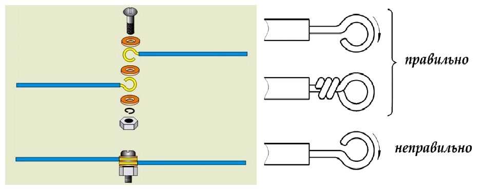 Сначала проводники зачищаются от изоляции, при необходимости снимается верхний окисленный слой. Далее из зачищенной части формируется петля, внутренний диаметр которой равен диаметру болта. Чтобы было проще — можно провод обернуть вокруг болта и закрутить (средний вариант на правом рисунке). После все это собирается в таком порядке: