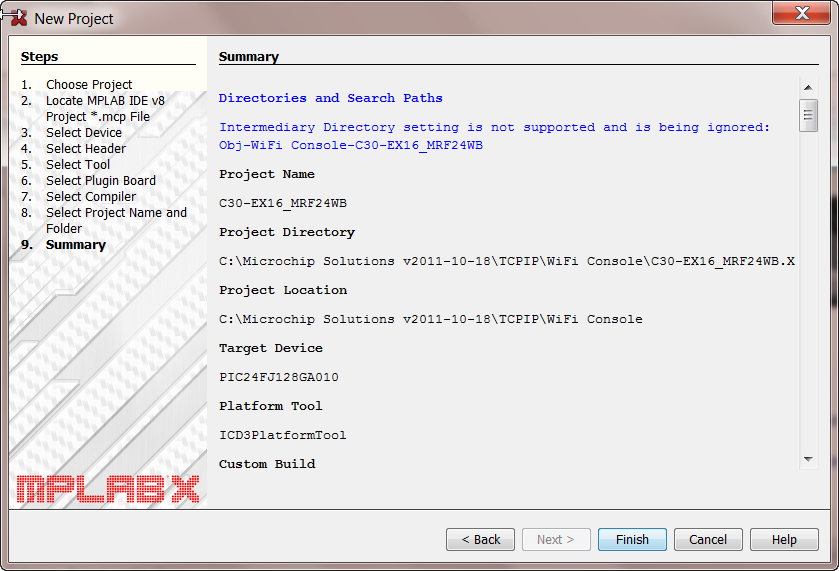 By default, the MPLAB X project directory will be created inside the MPLAB 8 project’s directory. Here, you can change the location and/or name of the new project and its directory. Click Next > when done.