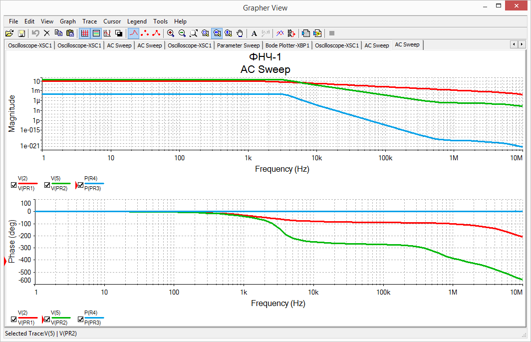 Эта функция позволяет проводить анализ по переменному току сразу в нескольких точках схемы и выводить на одном графике результаты анализа в этих точках. На рис. 6 приведена схема ФНЧ, в котором установлены пробники на выходе первого звена (PR1), на выходе фильтра (PR2) и пробник для измерения мощности на резисторе R4 (PR3).