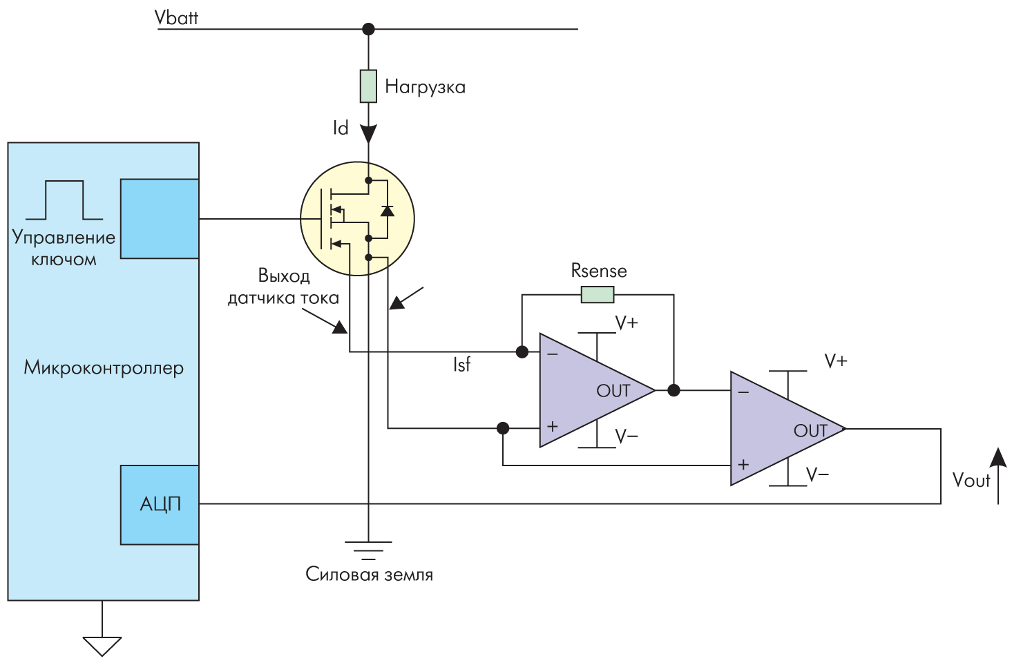 Рис. 2. Схема измерения тока нагрузки мощного MOSFET-транзистора с виртуальной землей