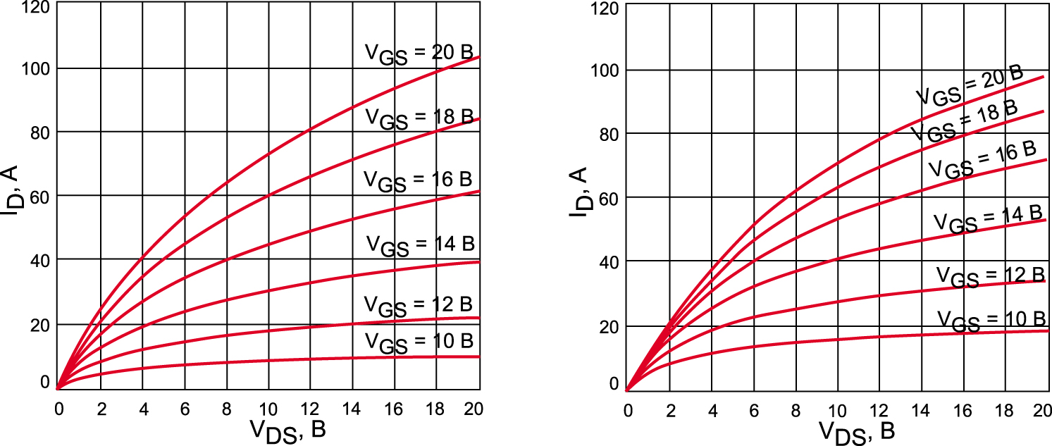 Рис. 1. Типовая выходная характеристика SiC MOSFET при температуре кристалла Tj = +25° (а) и = 125°C (б)
