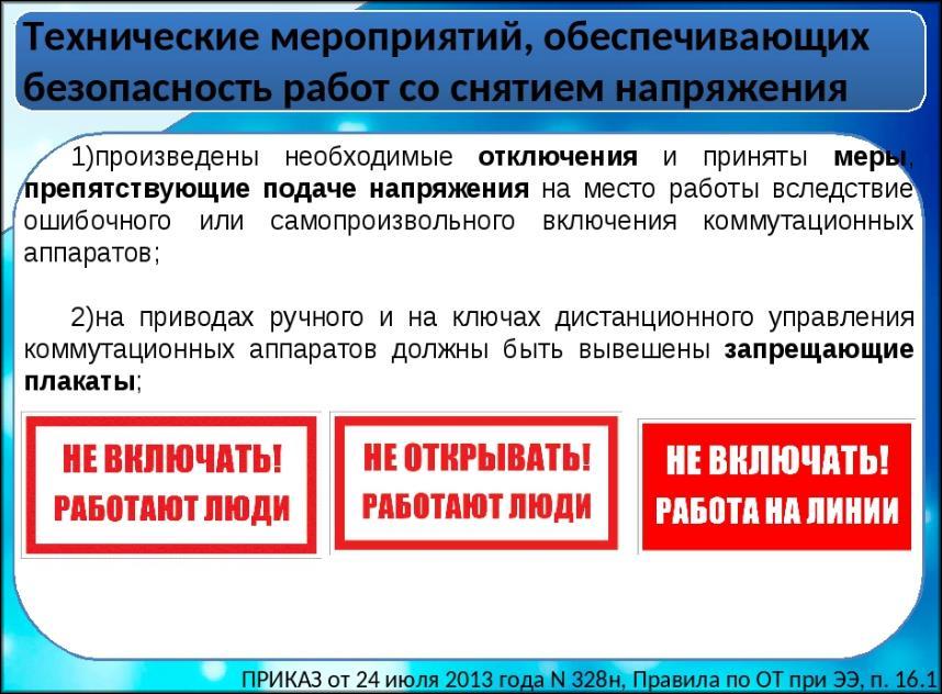 Если работник не пришёл соответствующий инструктаж по электробезопасности, то он не должен подходить к электроустановке. Допускающие лица обязаны выдать все необходимые средства защиты от удара током и высоковольтного напряжения.