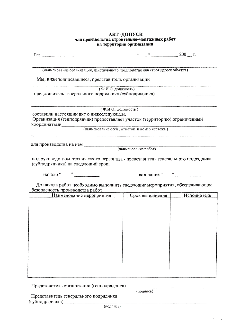 Акт-допуска – это бумага для допуска к рабочему процессу или на территорию предприятия сторонних рабочих. Он необходим для документального оформления такого сотрудничества и является пропускным документом рабочих в процессе всего периода их работы. Документ содержит полные данные о будущем характере и объеме работ, о проведении инструктажа со сторонними работниками и принятии всех необходимых мер для обеспечения безопасности их пребывания на объекте.