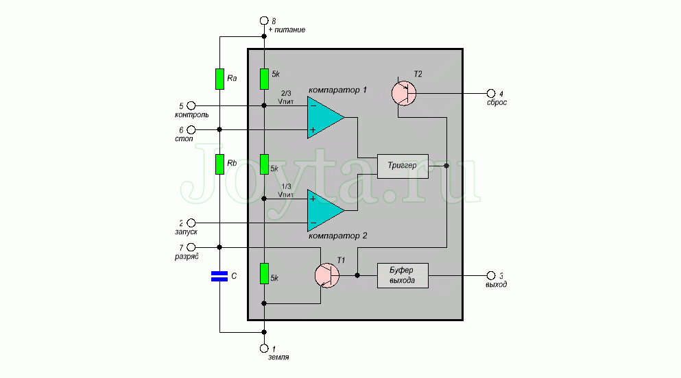 Входной внутренний делитель напряжения задает опорные напряжения для двух компараторов — верхнего и нижнего. RS-триггер принимает их сигналы и формирует выходной сигнал, который отправляет на усилитель мощности. Еще имеется дополнительный транзистор с выведенным наружу коллектором, который используется для подключения внешней времязадающей цепочки.