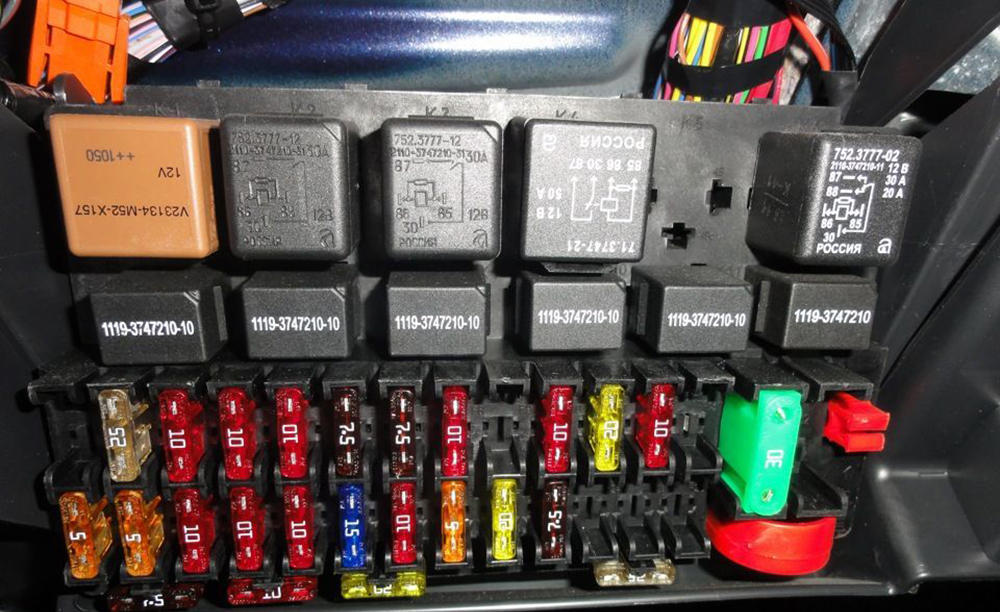 Если предохранитель перегорел в дороге и под рукой нет запасного, можно заменить его проволокой. Но при первой же возможности проволоку нужно убрать и установить вместо неё номинальный предохранитель. Схема расположения предохранителей изображена, как правило, на внутренней стороне крышки монтажного блока.