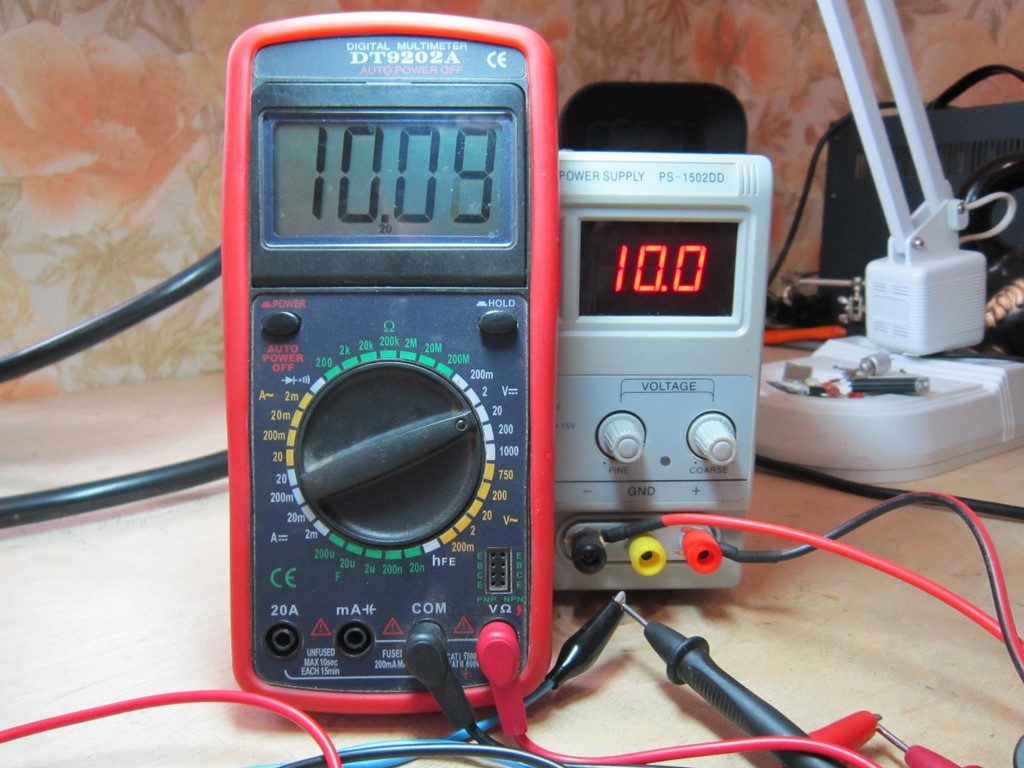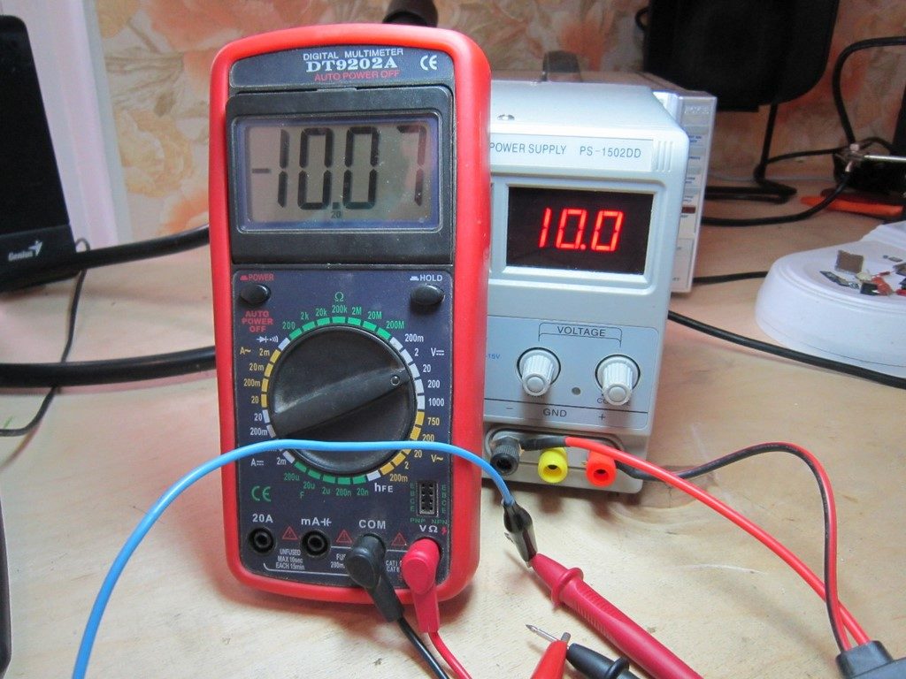 Давайте замеряем напряжение на блоке питания. Выставляем 10 Вольт и замеряем.