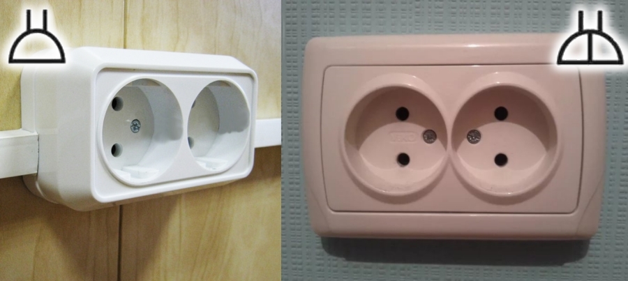 Розетка на два полюса (фаза+ноль) без заземления накладная или открытой установки – полукруг лежащий на разрезе, сверху одна вертикальная полоска, если полоски две, то розетка сдвоена.