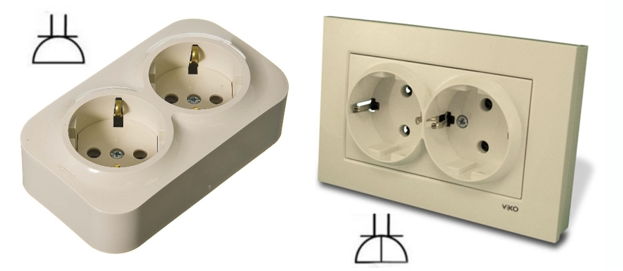 А вот так выглядят условные обозначения розеток сдвоенных, с защитным заземлением: