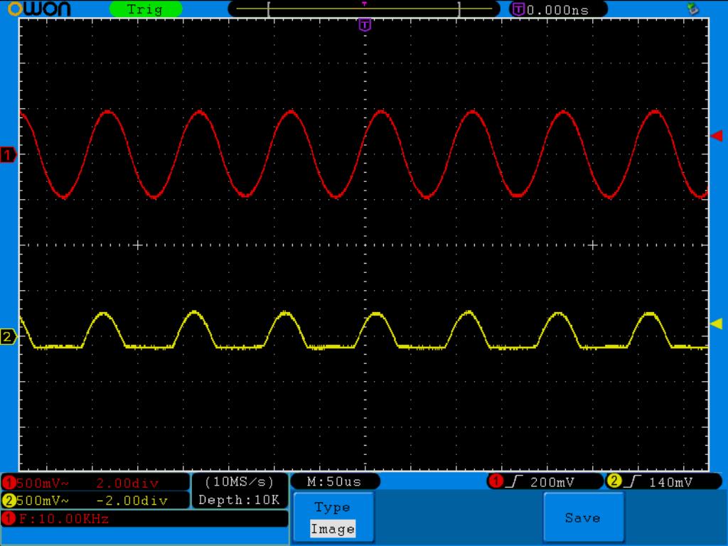 Есть, конечно, большой минус эмиттерного повторителя. Заключается он в том, что сигнал на выходе тупо срезается при отрицательной полуволне при сильной низкоомной нагрузке. Поставив резистор в 100 Ом, у нас получается вот такой ералаш: