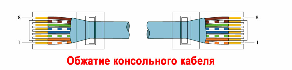 В этом варианте нужно один конец витой пары обжать по обратной схеме, по отношению к другому концу. Выглядит это, как будто вы перевернули его и глянули на штекер с другой стороны. Эту схему обжатия применяют, когда необходимо настроить роутер или коммутатор при помощи ПК. Чаще всего используют для устройств Cisco.