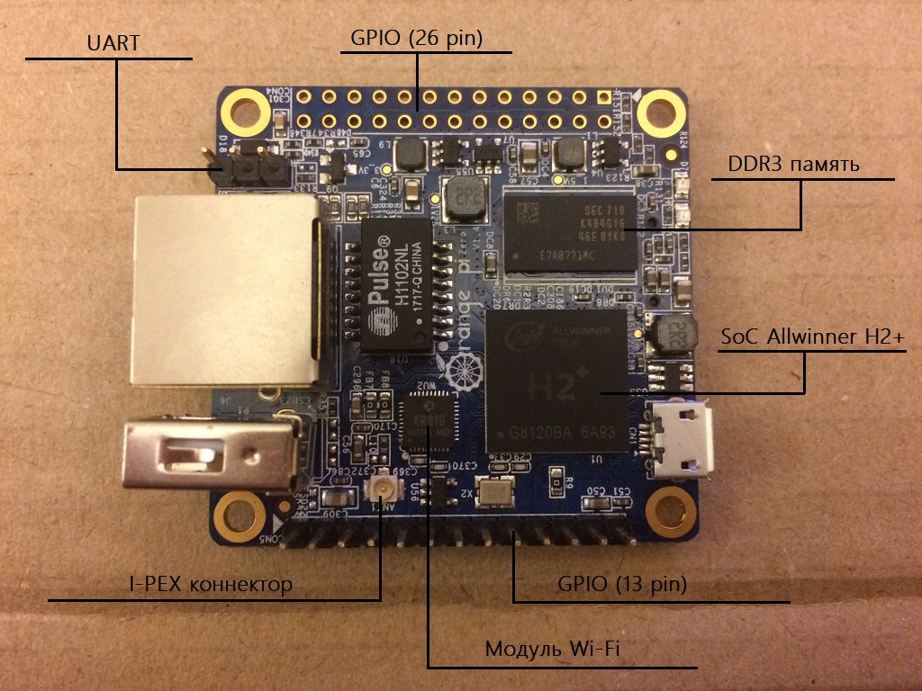 Самый крупный чип – SoC Allwinner H2+, рядом с ним расположен модуль оперативной памяти емкостью 256 Мб или 512 Мб в зависимости от версии Orange Pi Zero. А маленькая квадратная микросхема – чип Allwinner XR819, дешевый и компактный модуль Wi-Fi. Обычно Wi-Fi модули делают совмещенными с модулями Bluetooth, но XR819 Bluetooth не поддерживает. Нужно иметь это в виду и, если планируется использовать подключаемую по Bluetooth периферию, заранее озаботиться покупкой USB-адаптера.