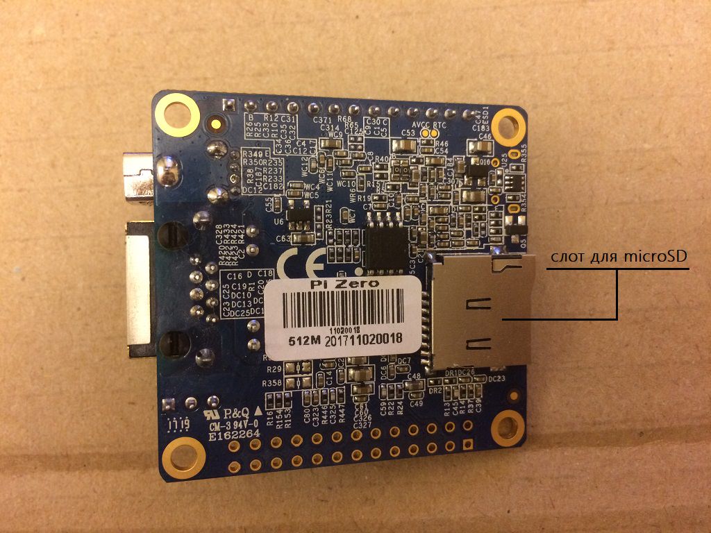 На обратной стороне печатной платы находится слот для microSD-карт и наклейка со штрих-кодом. По цифрам на наклейке можно предположить, что доставшаяся мне Orange Pi Zero была выпущена в ноябре 2017 года. При этом заказ я делал в первых числах декабря.