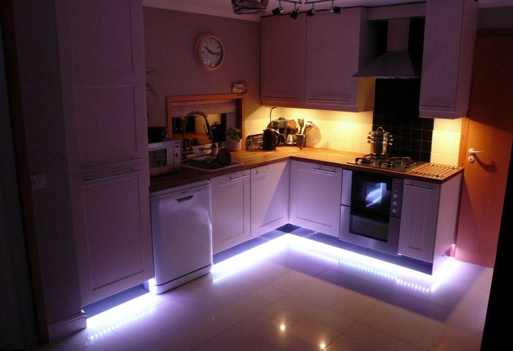 Подсветка пола кухни или освещение под кухней, стало набирать популярность после появления доступного светодиодного освещения. Светодиодная лента, расположенная в коробе на цоколе кухонных шкафов, создаёт оригинальное освещение пола кухни.