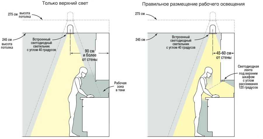 На кухне есть две основные зоны с разным назначением — рабочая зона для приготовления пищи и обеденная зона. Для каждой требуется разное освещение: в рабочей зоне должно быть более яркое освещение, а в обеденной — более мягкое.