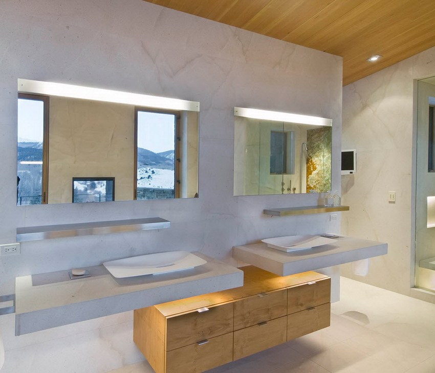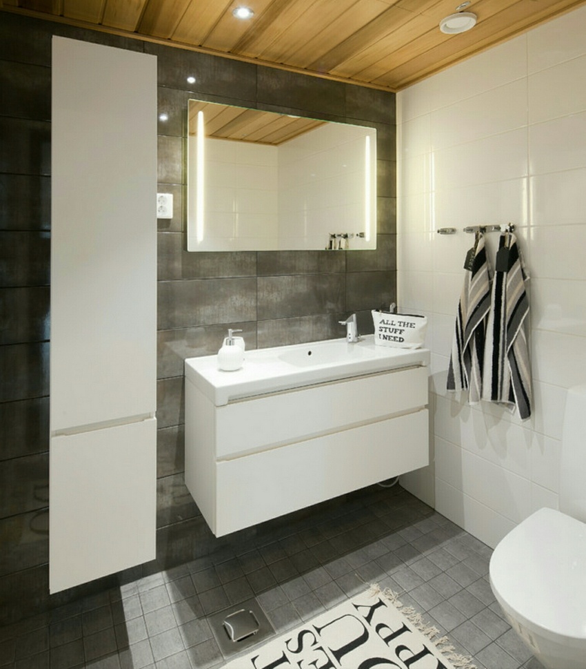 Особенно важно здесь осветить зону зеркала и шкафчиков с полками, если они есть. Например, чтобы бритье было комфортным, свет лучше располагать над зеркалом. А чтобы нанести макияж и привести себя в порядок, освещение должно быть двусторонним, слева и справа одновременно