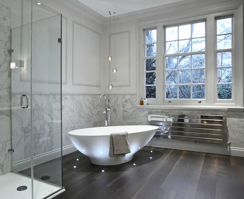 Нижнее освещение состоит из тех световых устройств, которые монтируются на пол и нижнюю часть стен ванной комнаты (также подается на фото).