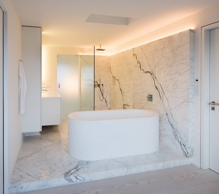 Освещение, как правило, расположено на потолке (в более редких случаях на стенах), но это далеко не единственный вариант размещения. Довольно необычно и интересно будет смотреться подсветка на полу комнаты — она рассчитана скорее на передачу рассеянного, чуть приглушенного света, что позволит вам расслабиться в ванной после тяжелого дня.
