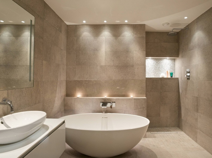 Если говорить о верхнем типе освещения, то он представляет собой осветительные приборы, которые монтируют на потолке ванной (можно увидеть на фото ниже).