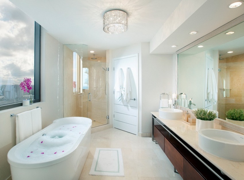 Сколько бы вы ни запланировали источников света в ванной комнате, потолочное освещение должно быть в обязательном порядке. Так как ванная комната – это помещение с повышенной влажностью, то лучше всего выбирать закрытые люстры плафонного типа. Лучше всего для ванной подойдет светильник-прожектор. В нем можно регулировать поток света и качественно осветить максимум пространства.