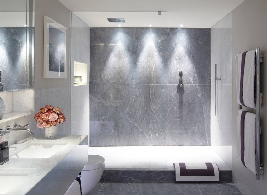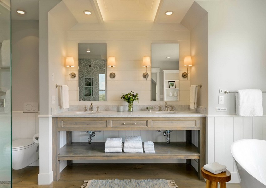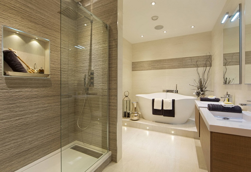 Если ванная позволяет использовать ее как комнату с несколькими функциями, то стоит освещать каждую зону отдельно.