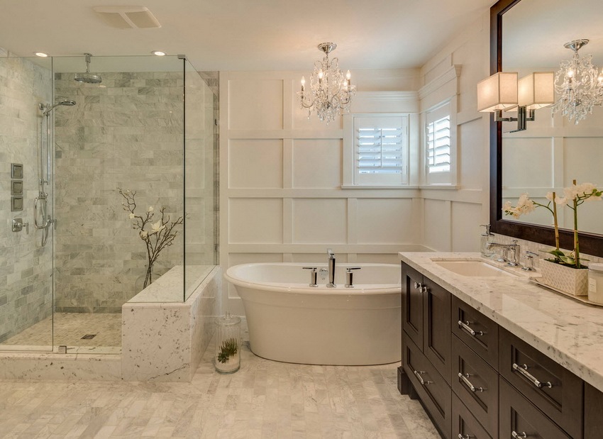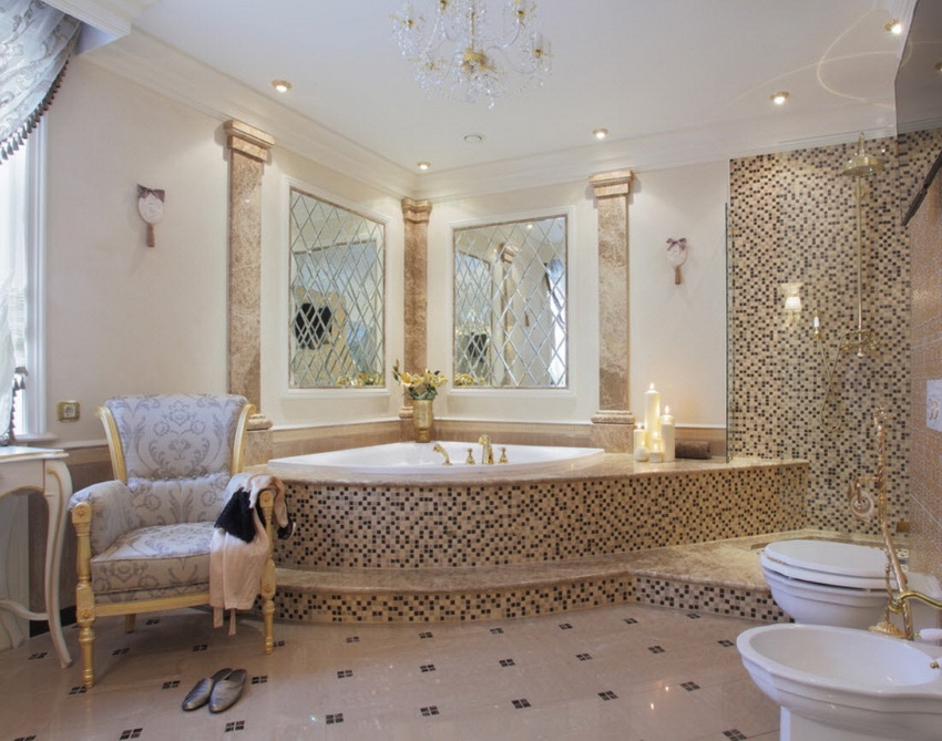 Английский стиль, о котором мы писали ранее, идет еще дальше и предлагает повесить в ванной комнате роскошную хрустальную люстру, а на стенах расположить бра в том же стиле. Идея довольно-таки спорная с практической точки зрения, но смотрится это очень красиво.