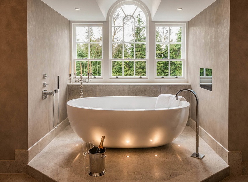 - Для просторной ванной, но с несильно высоким потолком можно установить высокий торшер. Так свет будет красиво падать на воду.