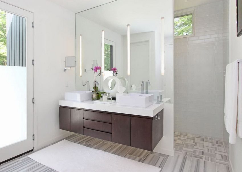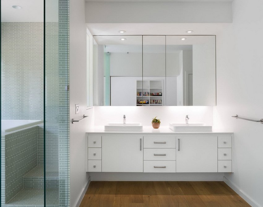 Выбирая светильник, обратите внимание на защиту его корпуса от влаги: брызги в любой момент могут попасть на лампу, особенно когда она размещена непосредственно рядом с раковиной и ванной. Часто вместо зеркала приобретается сразу целый настенный шкаф: зеркальные створки, в которых можно наблюдать свое отражение, растворяются, и внутри хранится все необходимое для умывания, а также косметические запасы