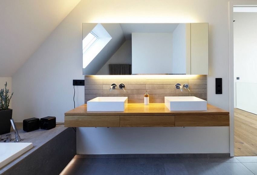 Это позволит направлять свет в нужном направлении. Также можно использовать и светодиодную ленту, которая может размещаться за зеркалом и над умывальником.