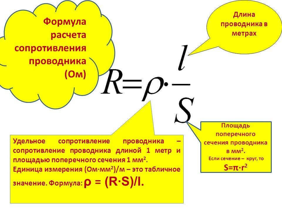 Размерность проводников также имеет значение. Электрическое сопротивление (R) равно удельному значению для определенного материала (Rуд), умноженному на длину (L) и деленому на соответствующее поперечное сечение (S). Если известен только диаметр, то для круглой жилы можно применить классическую формулу из школьного курса геометрии: