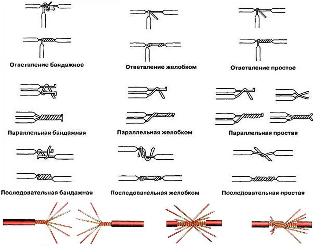 Прежде чем паять провода, их нужно правильно скрутить. Основные виды скруток проводов для пайки показаны на рис. У каждого из них свое предназначение: