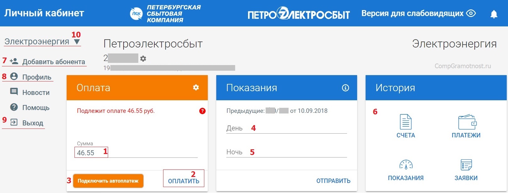 После регистрации у Вас будет личный кабинет на официальном сайте Петроэлектросбыта, в котором можно