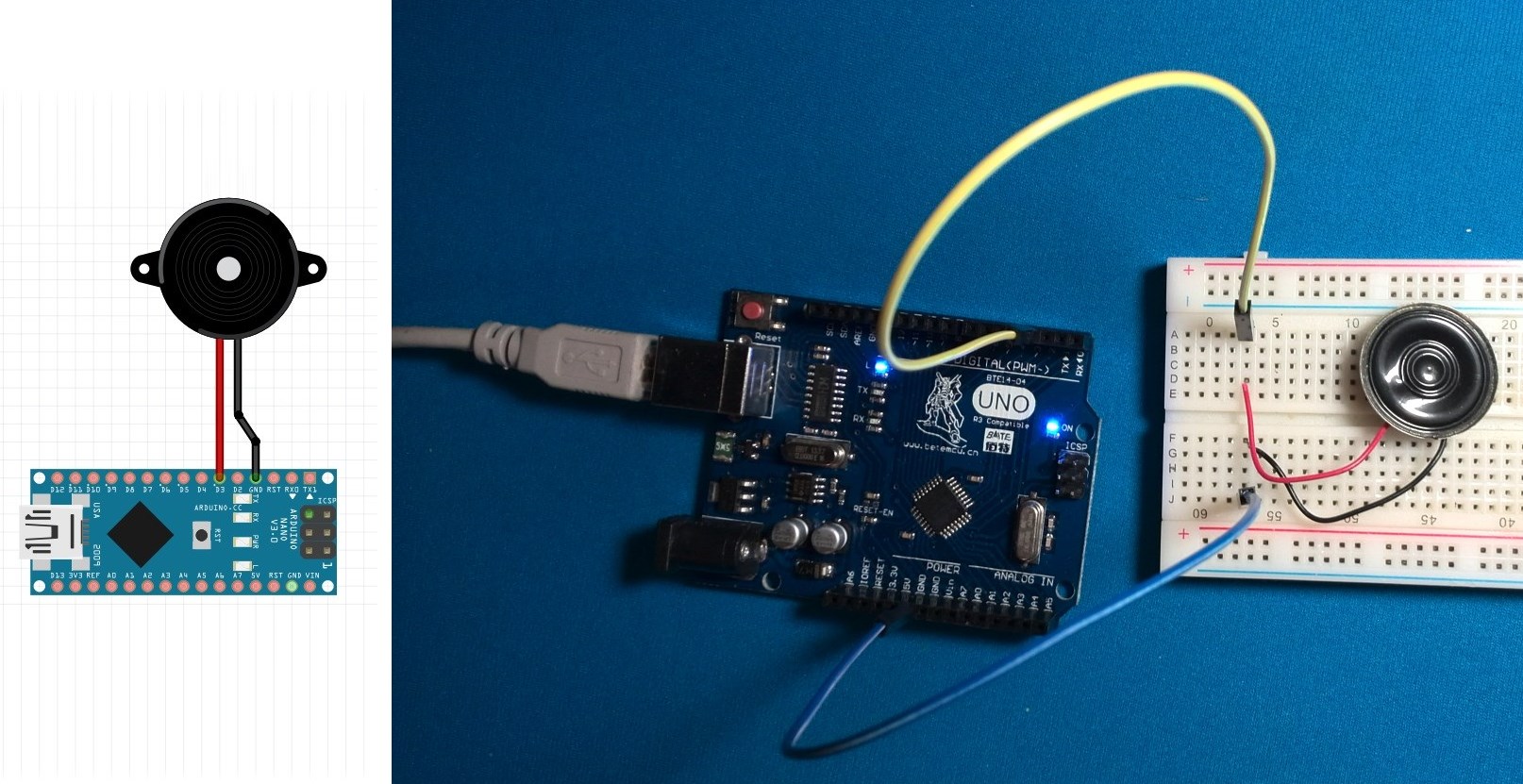 Схема подключения пьезоизлучателя к Arduino и схема, собранная на макетной плате