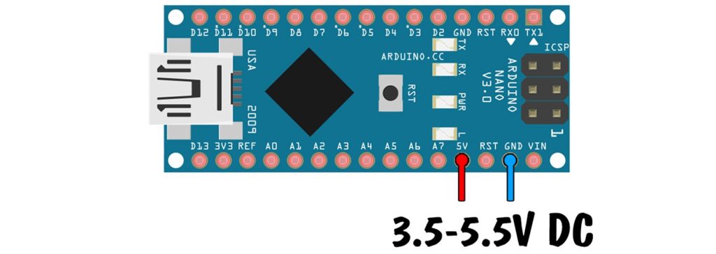 Arduino Nano может быть запитан через кабель mini(micro)-USB, от внешнего источника питания с нестабилизированным напряжением 6-20 В (через вывод 30, подавать на этот вывод больше 12 В настоятельно не рекомендуется) либо со стабилизированным напряжением 5В (через вывод 27). Устройство автоматически выбирает источник питания с наибольшим напряжением.