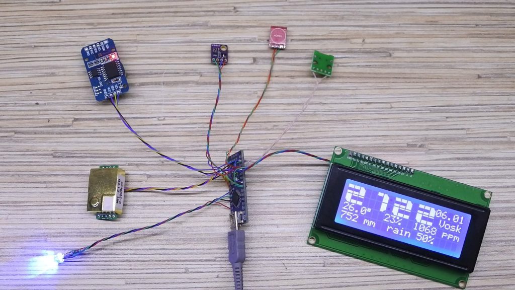 Самый популярный вариант – USB зардяник от смартфона, их легко достать, диапазон токов от 500ма до 3А – справится практически с любым проектом. Отрезаем штекер и паяем провода на 5V и GND, предварительно определив, где плюс/минус при помощи мультиметра или по цвету: красный всегда плюс, чёрный – земля, при красном плюсе земля может быть белого цвета. При чёрной земле плюс может быть белым, вот так вот. Точно туда же паяем все датчики/модули/потребители 5 Вольт. Да, не очень удобно это паять, но при известной схеме можно аккуратно собрать всё питание в отдельные скрутки и припаять уже их. Пример на фото ниже. Источником питания там является отдельное гнездо micro-usb, зелёная плата сразу над дисплеем.