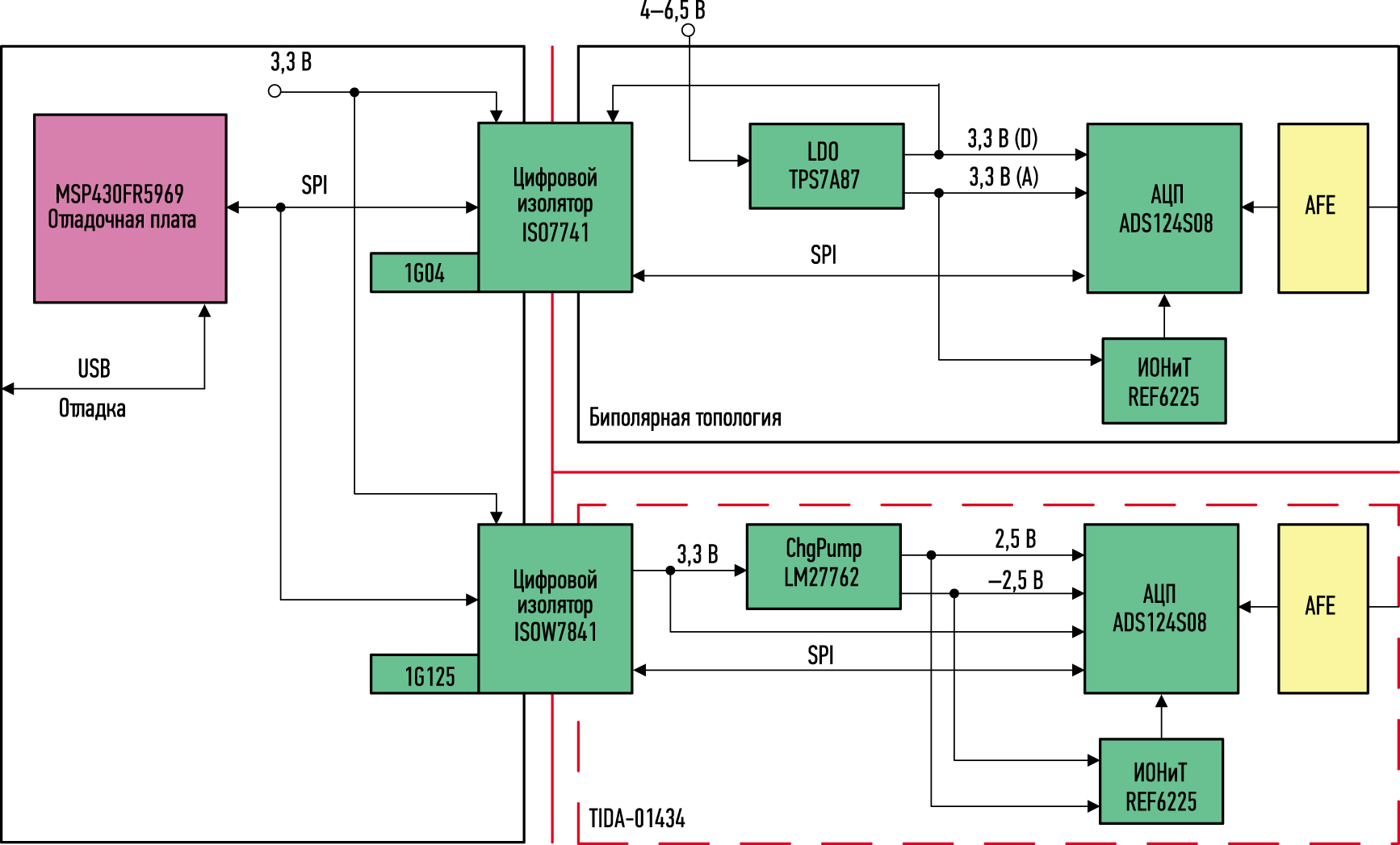 TIDA-01434 предназначен для работы в качестве одно- или многоканального аналогового входа с биполярными входными сигналами и применяется в большинстве случаев для построения решений на базе ПЛК, но не ограничивается только этим. Модуль подходит как для систем типа «канал-канал» (channel-to-channel), так и для входов с групповой изоляцией. В системе channel-to-channel каждый канал входного сигнала имеет собственную «землю» — такая топология позволяет работать с входными сигналами с большей разницей потенциалов. При использовании топологии групповой изоляции величины допустимых напряжений ограничены. В данном случае предпочтительно использовать топологию типа channel-to-channel.