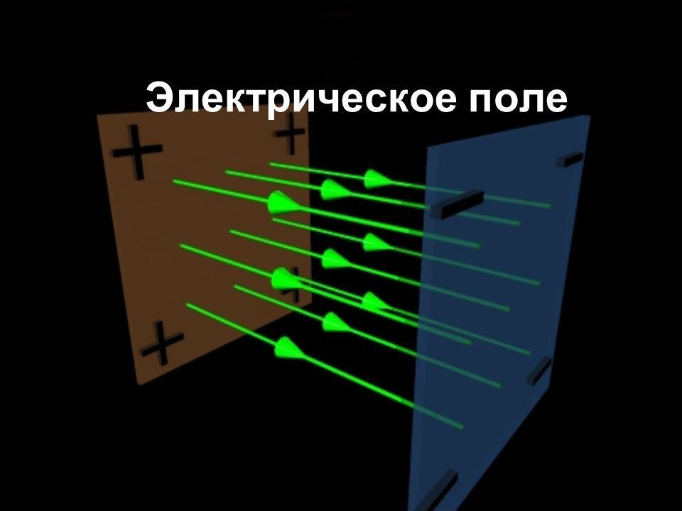 В результате, они заряжаются, и между этими двумя пластинами создается однородное электрическое поле, которое характеризуется таким параметром, как напряженность. По идее, чем больше мы подадим напряжения между пластинами, тем напряженнее стает поле между этими пластинами. Физика, 7-8 класс