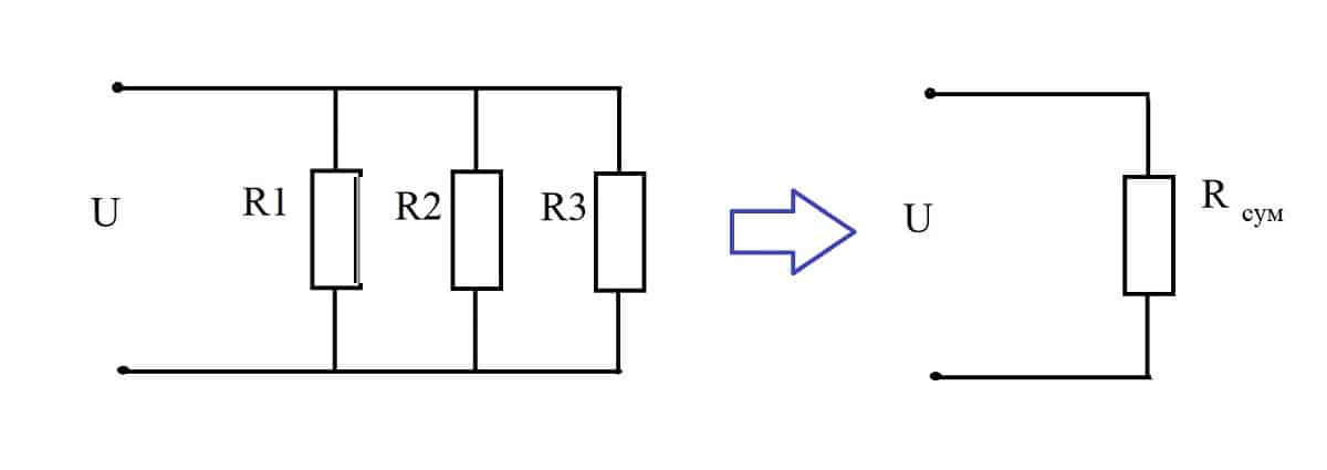 Так те же нити накаливания представляют собой чисто резистивную нагрузку, поэтому мы их будем рассчитывать, как сумму резисторов R1 – R3. Для параллельных схем включения вычисление суммарного сопротивления всех устройств производится исходя из соотношения: