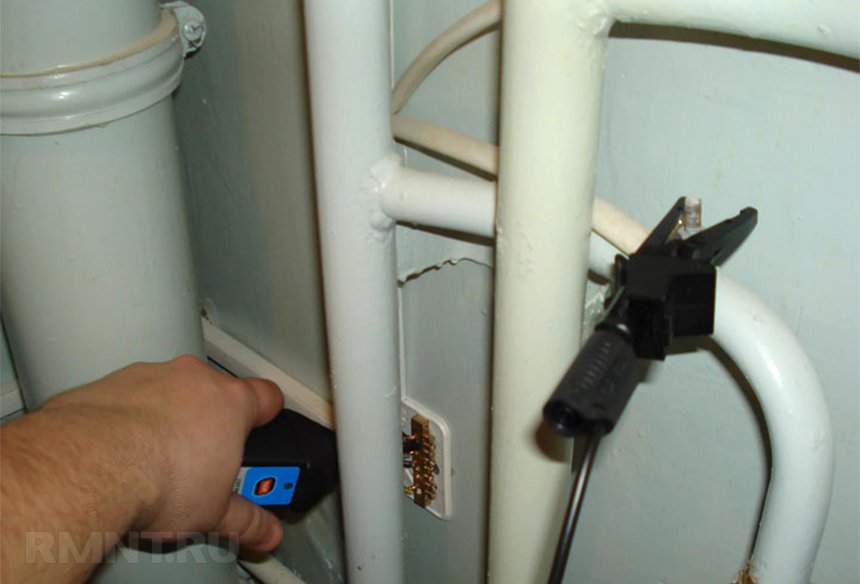 Стиральная машинка либо водонагреватель не заземлены и при выходе из строя бьются током. Если до сих пор Вы не сделали заземление в частном доме, то как можно быстрее решите этот момент. Желто-зеленый провод, именуемый также «землей» защитит Вас при утечках электричества, тем самым кран либо трубы не будут щипаться. О том, как заземлить проводку в квартире мы также рассказывали. Повреждение изоляции в проводке. Очень часто причиной неисправности является перебитый провод в стене, который, собственно, и создает утечки электрического тока на металлический кран, ванну и влажные стены. Найти обрыв провода в стене можно с помощью специального прибора для поиска скрытой электропроводки. Если у Вас нет навыков в использовании таких приборов, можете ознакомиться с нашей инструкцией либо вызвать профессионала, чтобы он нашел проблемный участок. Если струя воды из крана бьет током, то вероятнее всего произошел выход из строя ТЭНа водонагревателя. Проверить этот момент можно с помощью мультиметра, опять-таки, если знать, как им пользоваться. Если Вы живете в квартире, то, возможно, водонагреватель сломался у соседей, в результате чего вода из смесителя щиплет пальцы. Также, в случае с квартирой, довольно часто весьма необразованные соседи делают заземление в ванной, подключая провод PE к стояку. Как результат — при утечках у них в квартире током бьет Вас. Сюда же можно отнести еще один неблагополучный случай. Некоторые соседи пытаются сэкономить на электроэнергии, подключив нулевой провод к водопроводным трубам, что позволяет отматывать электросчетчик. Как Вы понимаете, при таком подключении электричество будет проходить по трубам и к Вашей ванной, в результате чего, кран и влажные стены будут немного бить током.