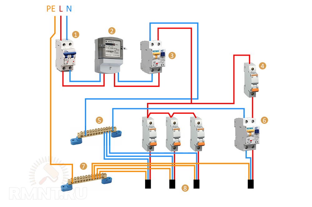 Схема подключения УЗО: 1 — вводной автомат; 2 — счётчик; 3 — УЗО типа S; 4 — автоматы; 5 — нулевая шина; 6 — УЗО к потребителю; 7 — шина заземления; 8 — трёхжильный провод