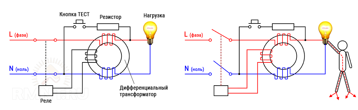 Оградить себя от удара током можно двумя способами. Один из них заключается в обесточивании техники при прохождении электричества через тело человека, другой — в построении обходного пути, по которому электричество будет стекать в землю. Первый тип защитных мер подразумевает установку устройств дифференциальной защиты. Они сравнивают количественное значение тока, протекающего по обоим проводам петли фаза-нуль, и отключают питание, если эти значения не эквивалентны.