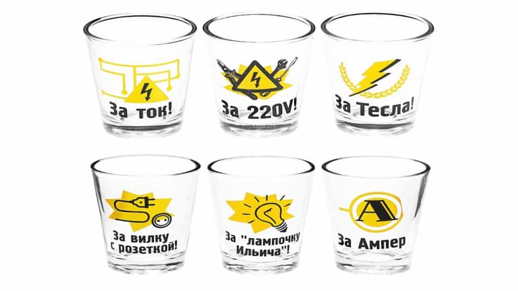 - Набор рюмок электрической тематики. В рекламном агентстве на набор стопок можно нанести различные тематические картинки. Такой подарок будет приятно показать в большой компании друзей.