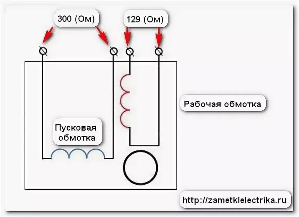 Сначала при помощи измерений определяем какая обмотка рабочая, какая — пусковая. Обычно вывод от мотора имеет три или четыре провода.