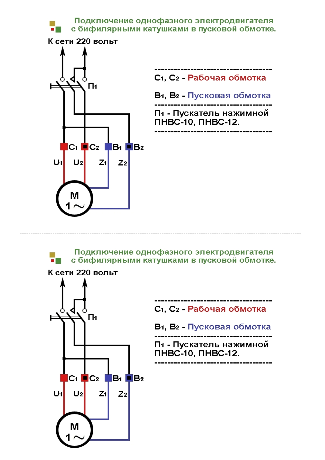 Подключение однофазного двигателя с пусковой обмоткой через кнопку ПНВС