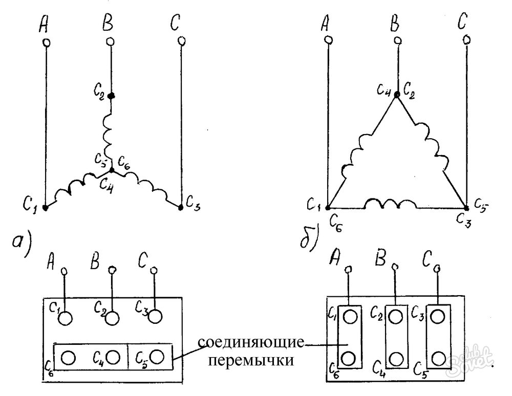 Начало и конец каждой обмотки подписан в соответствии с вышеприведённой цифробуквенной номенклатурой. Пользователю остаётся изучить схему соединения по перемычкам: по какой схеме выполнено соединение – звездой или треугольником.