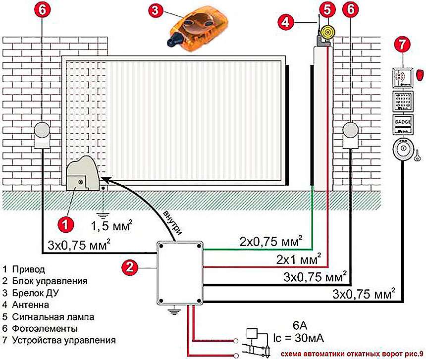 Типовая схема силовых и сигнальных линий автоматики откатных ворот