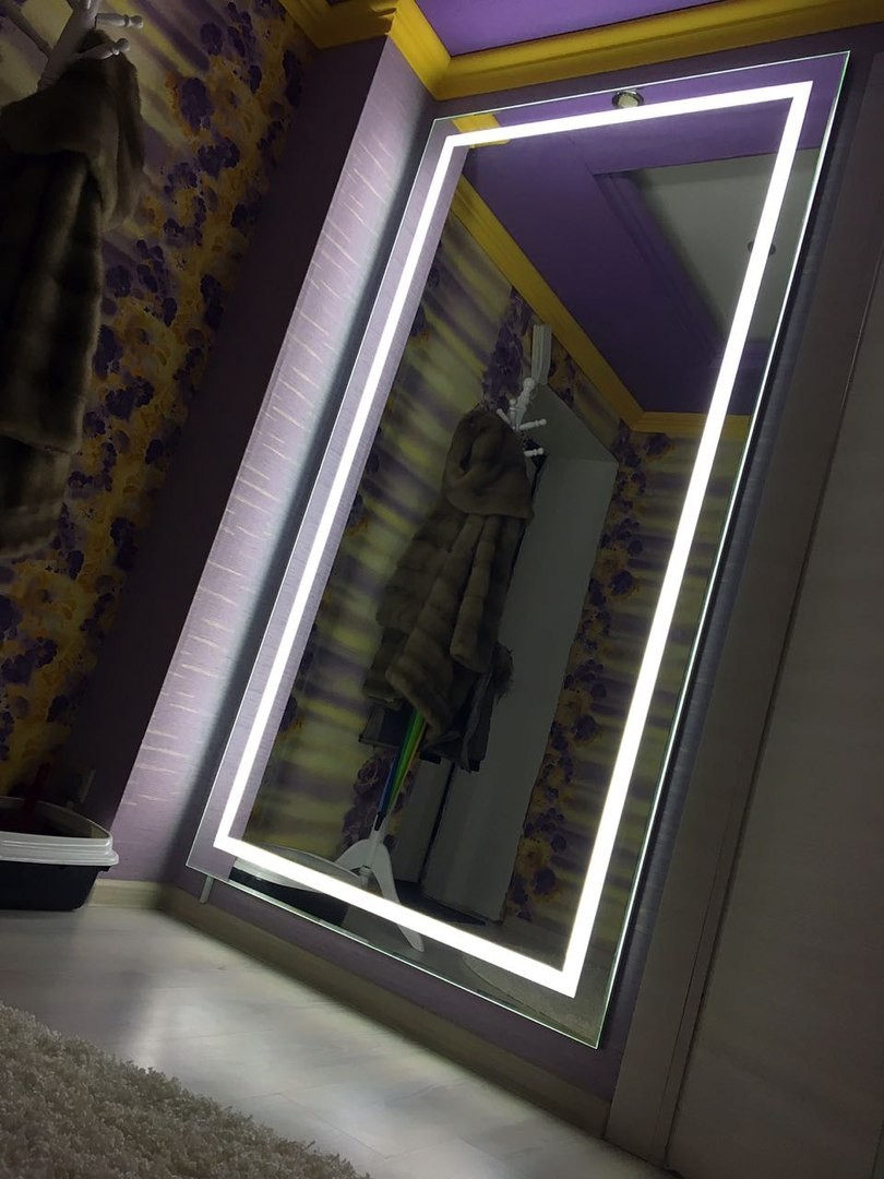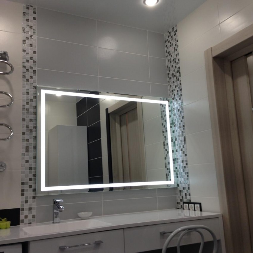 Внутренняя подсветка оборудуется с помощью светодиодной ленты, которую встраивают непосредственно в зеркало. Сверху ее накрывают матовым стеклом, обеспечивающим мягкое рассеивание. Модули располагаются по периметру, бокам или сверху.