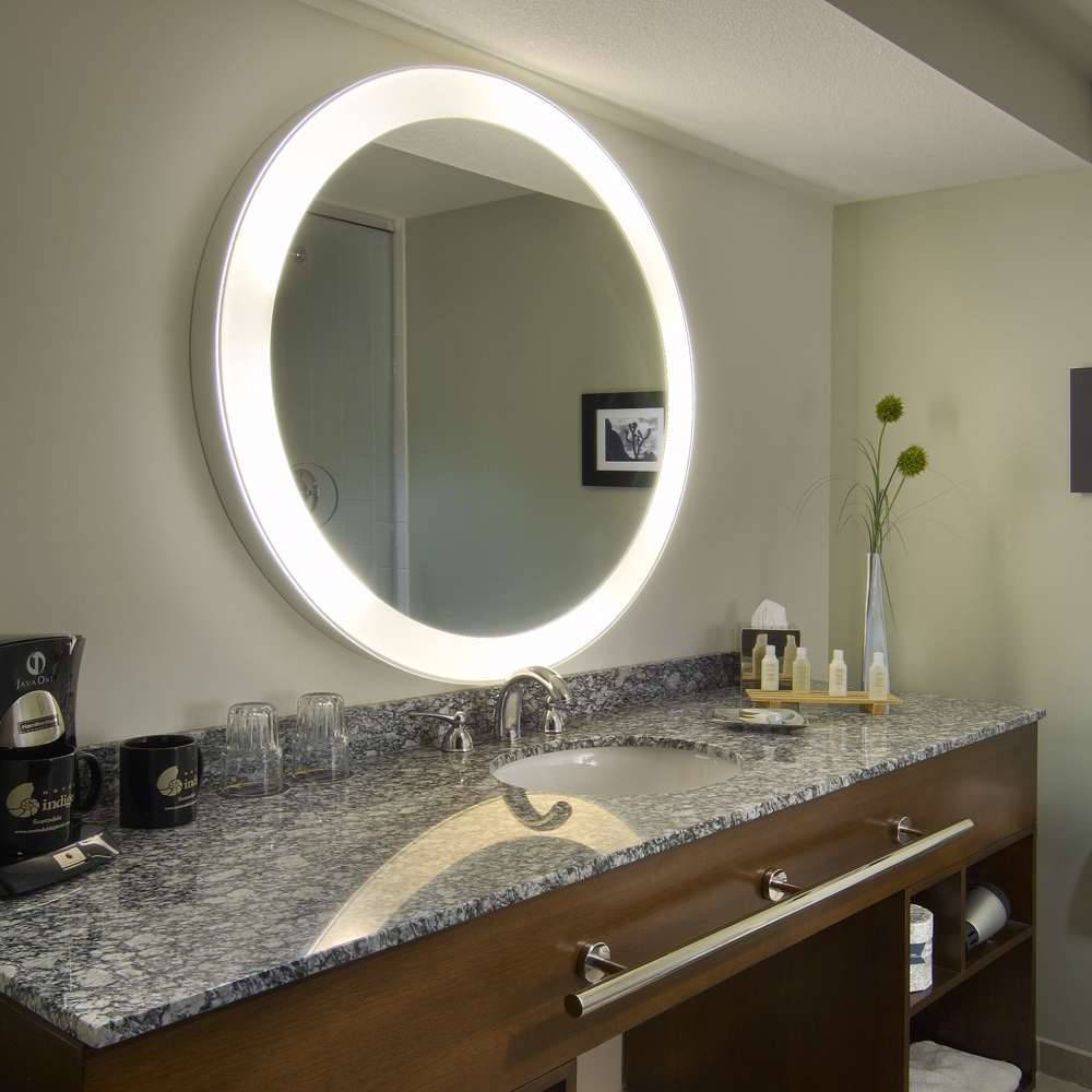 - адекватное расположение освещения – встроенное не причиняет дискомфорта, бросая блики на поверхность или направляясь прямо в глаза, основное также не отражается в зеркале, освещая человека, а не предмет.