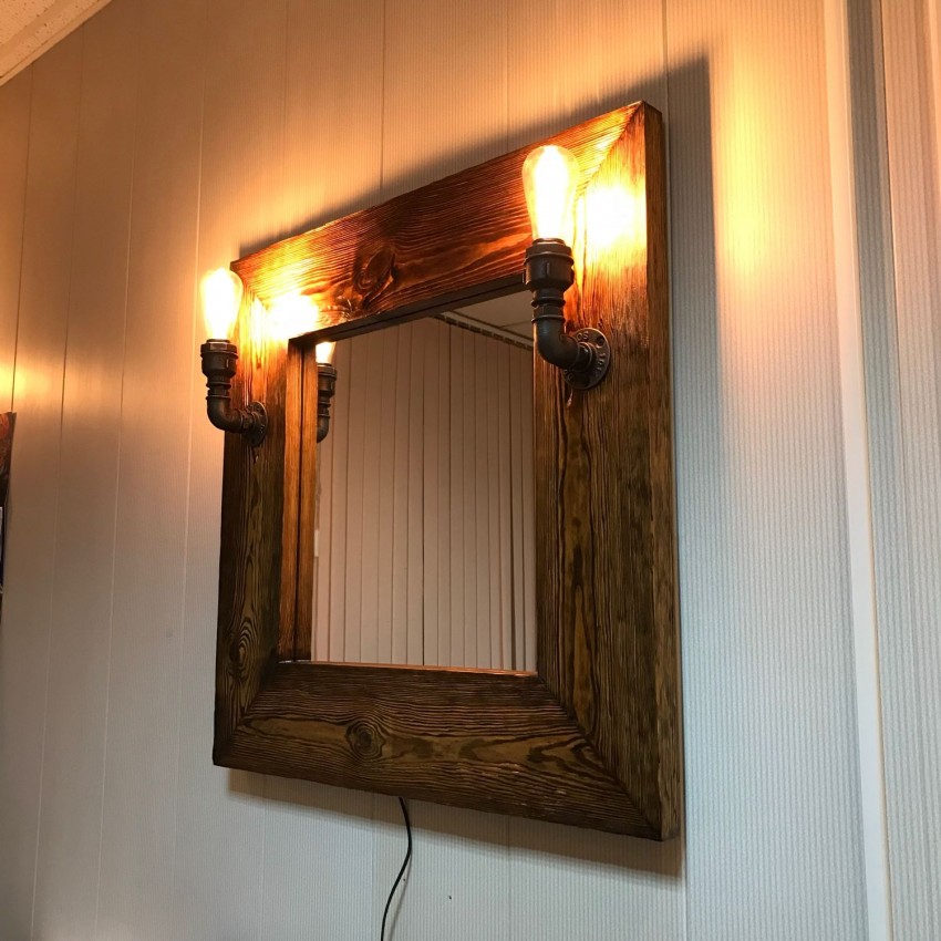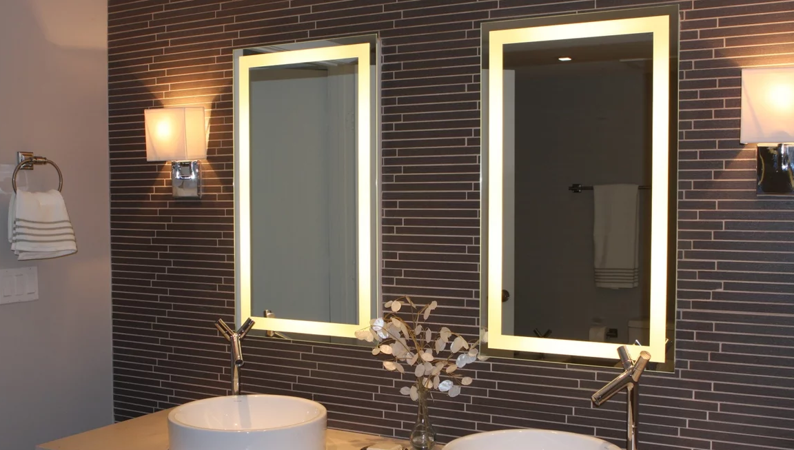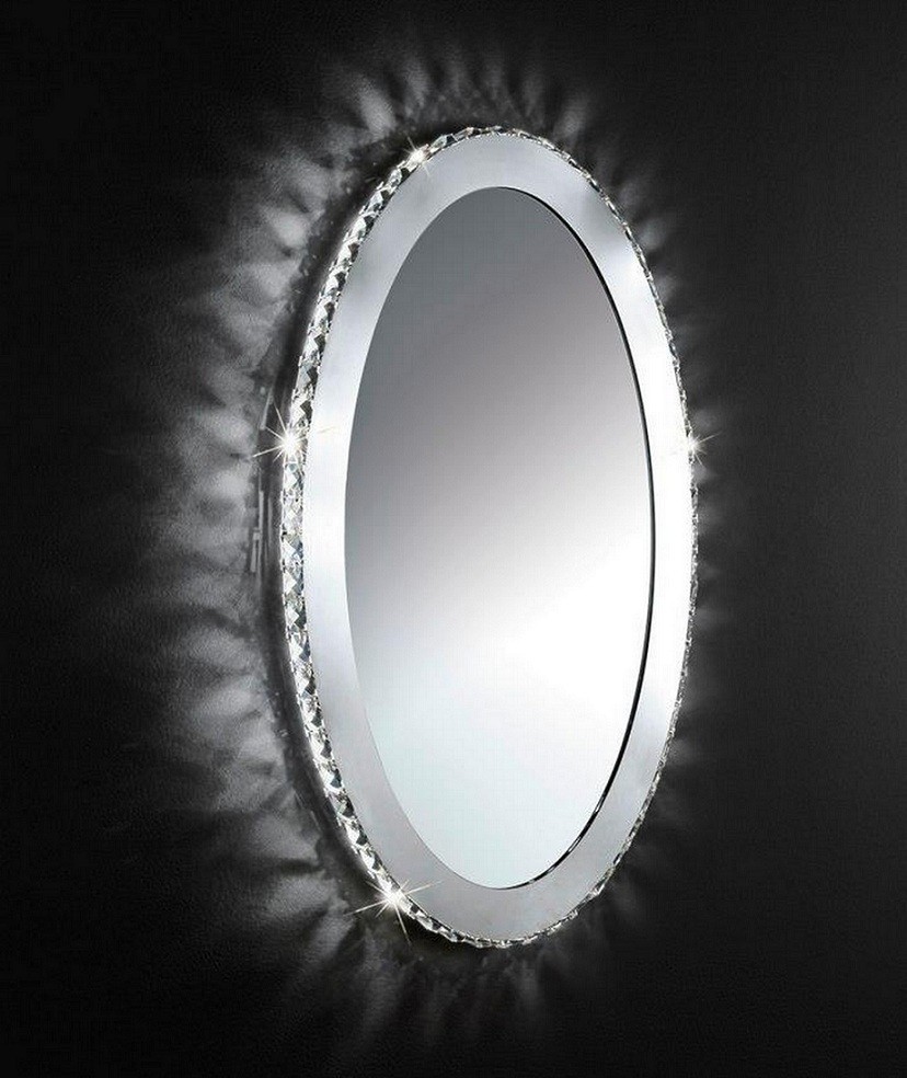 Предметы интерьера с нержавеющим оформлением намного практичнее никелированных. Долговечно служит пластик. В зависимости от используемых ламп, различают модели с наружной и внутренней подсветкой. При наружной светильники монтируются в обрамление рамы в виде спотов или бра. Внутренняя предполагает светодиодное контурное оформление периметра.