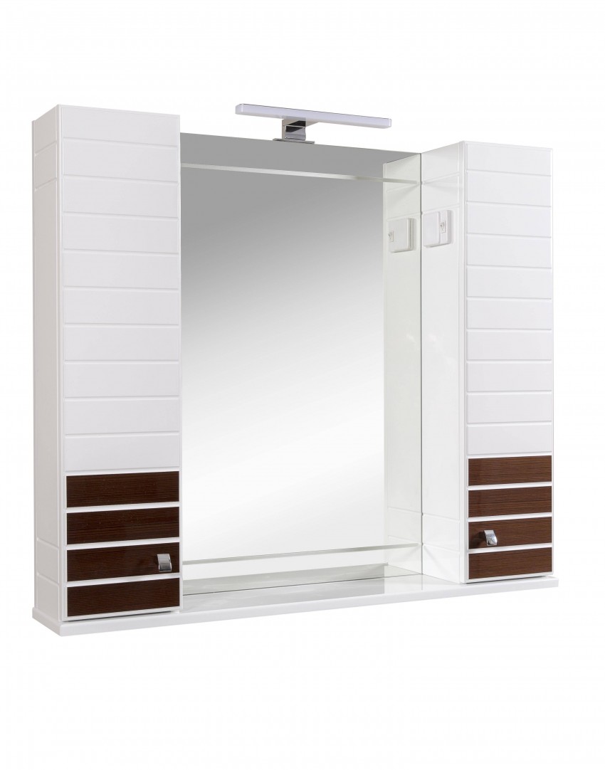 У светильников с креплением на зеркало есть явные преимущества: они не требуют деталей для установки, все необходимое найдется в наборе комплектующих. Практически все настенные модели со светильниками для ванных комнат оснащены регуляторами угла наклона, мощными подвижными шарнирами. Есть модули, где помимо отражающего полотна предусмотрены полочки или встроенные шкафчики для туалетных принадлежностей. Они заменяют шкаф. На зеркальной поверхности не образовывается конденсат при повышенной влажности, резком перепаде температуры. Лампы или специальные вмонтированные тэны равномерно прогревают воздух вокруг отражающей поверхности.
