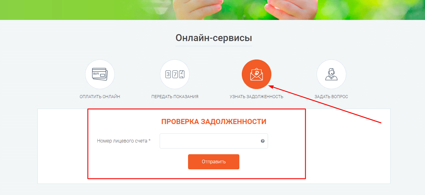 Откроется окно, куда нужно ввести номер лицевого счета, указанный на полученной квитанции (даже если документ пришел на электронную почту, там будет написан необходимый набор цифр). Остается только нажать кнопку «Отправить». На экране сразу же высветится: есть ли задолженность и, если есть – появится сумма долга.